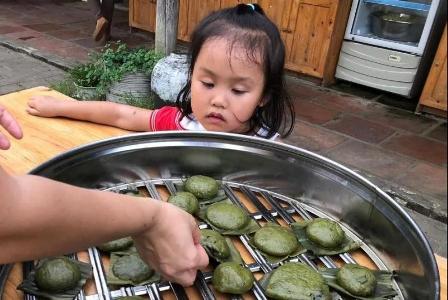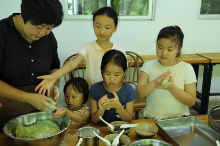 耕讀心園,位于五桂山腳下,坐擁30畝土地,種植了大量的蔬菜和瓜果,還有一片荷塘。活動期間,心園的老師帶著孩子們參觀農場,帶孩子們認識每一種植物,并耐心的為他們講解辨別和食用的方法。還采摘了艾葉一起做了艾餅。蒸熟后,孩子們一起分享自己做的小點心,格外有趣。大人們也重返童年,到荷塘采摘蓮蓬,品嘗新鮮的蓮子,清甜爽口。