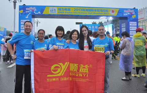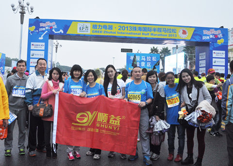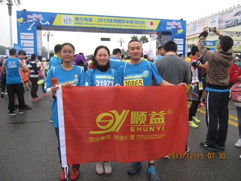 2013年12月15日早上8點整,發令笛聲吹響,第五屆珠海國際半程馬拉松賽在珠海九州城正式拉開了帷幕。頓時,珠?!皠印逼饋砹?。2萬多名選手帶著歡呼聲如潮水般跑起來,跑道兩邊舞動的彩旗和加油助威聲此起彼伏。運動員們奔跑在山海相間、線性流暢的賽道。本次順益公司和順益旗下的威潤瑪工業設備維護有限公司的參賽運動員共有24人,其中男士11名,女士13名。